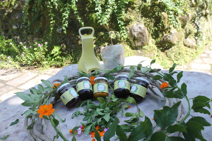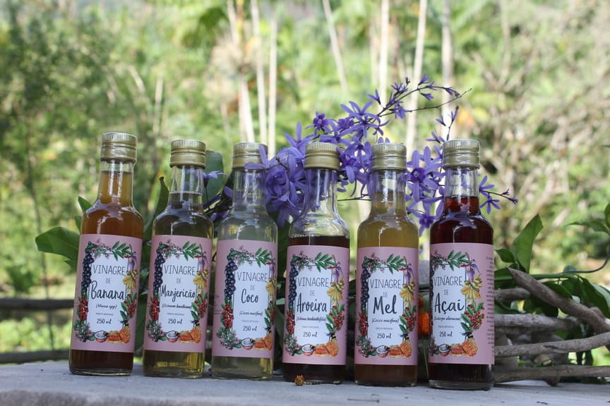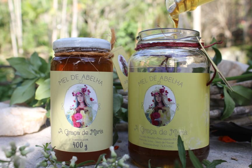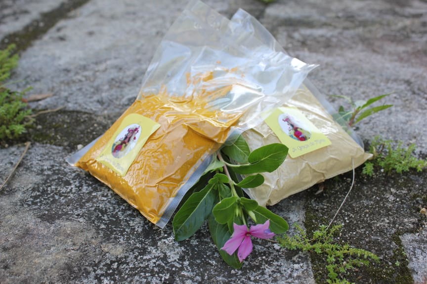 A cúrcuma do sítio A Graça de Maria é produzida e processada no sítio_ o que quer dizer: plantada, colhida, lavada e seca ao sol, para depois ser pulverizada e transformada em um pó dourado.